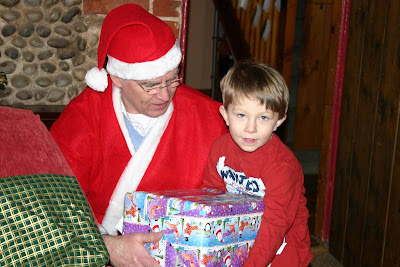 James LOVED handing out the presents ... and spent the rest of our time at Nanny and Grandad's wrapping things (mostly cars) up in scraps of paper to hand out as presents.